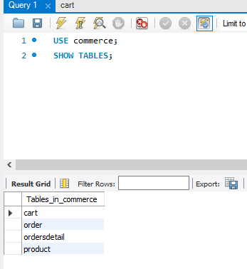 : 앞에 생성한 script 로 db table 생성하여 show tables로 table 확인!