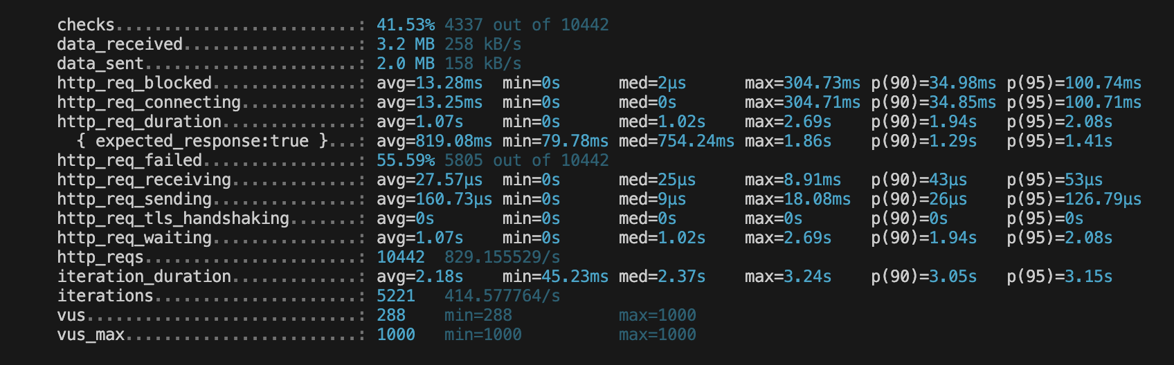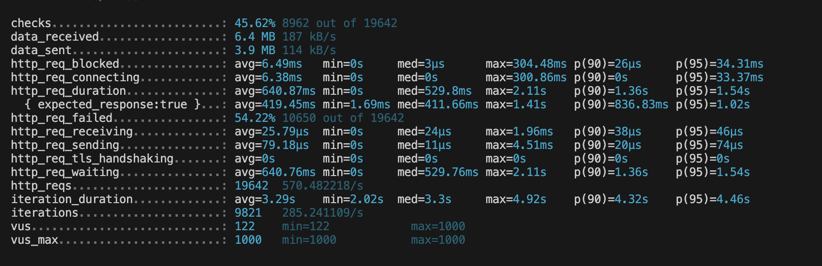 1000명의 사용자가 10초 내 30개의 재고상품이 있는 상품을 구매할 수 있는 동시성(부하테스트)를 실행한 결과이다.