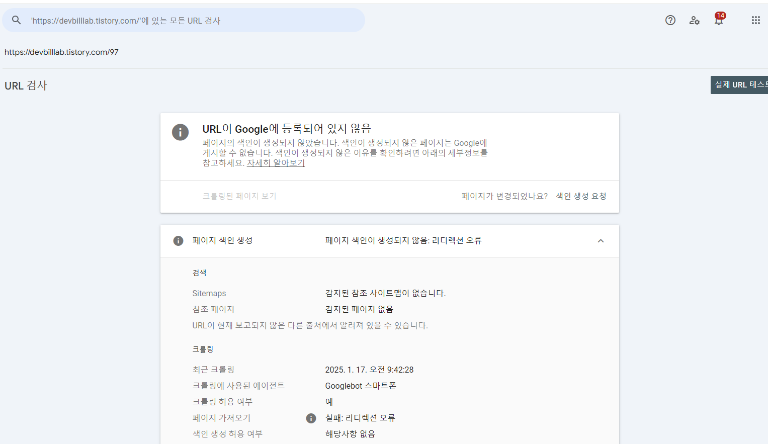 하지만, 아래와 같이 어떤한 이유에서 URL 이 Google에 등록되지 않는경우가 있다.