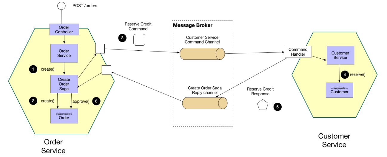 각 service 가 저장된 domain 사이에 message queue 를 활용하여 해당 domain에서는 처리할 수 있는영역만 저장을 하고 그외적인 부분을 Message Broker 를 통해 타 domain에서 처리해야할 부분을 전달한다.